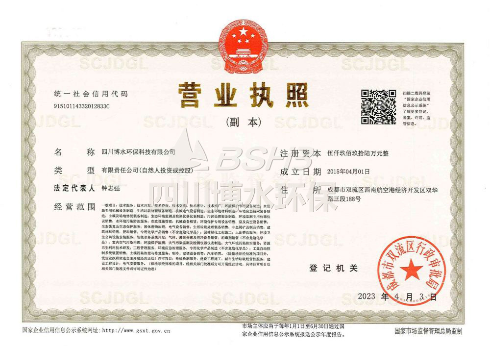 博水环保已成为四川省高新技术企业、四川省环保产业协会理事单位、中国环保产业协会会员,前后获得70多项国家技术专利及软件著作权、水污染治理甲级、环保设备制造甲级、污水处理设施运维二级、市政工程总承包三级、环保工程三级、机电安装工程三级等相关资质;通过了ISO9001/2015质量/环境/健康、质量服务AAA示范单位等体系认证;